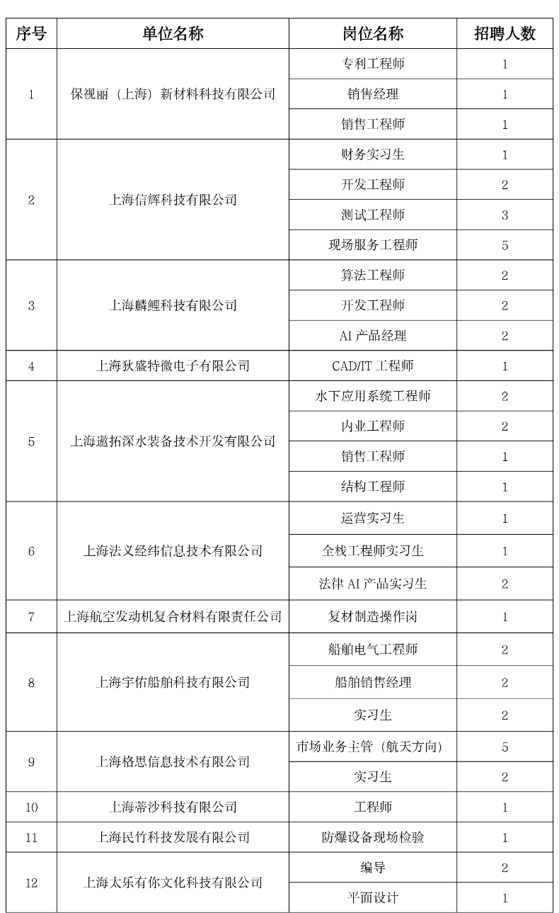 本次招聘会在临港新片区管委会的关心指导下,由临港新片区人才发展服务中心、海洋高新公司共同主办,上海海洋大学、上海海事大学、上海电力大学、上海电机学院、上海建桥学院、上海交通大学中英国际低碳学院、上海财经大学滴水湖高级金融学院以及华东师范大学滴水湖国际软件学院共同协办。活动现场将汇聚临港新片区23家优质企业,带来79个待招岗位、170余个招聘名额,涵盖海洋科技、集成电路、人工智能、高端装备制造、民用航空、新材料等多个前沿领域。